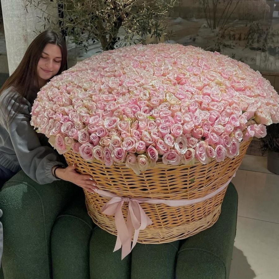 На фото 1001 розовая роза в корзине «чудо». В составе: роза 1001 шт, корзина (xl) 1 шт, оазис флористический 22 шт, . Все цветы свежие и ароматные, букет красиво оформлен и отлично подходит для подарка. Доступна доставка цветов или самовывоз.