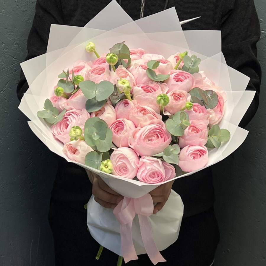 На фото букет из 29 розовых ранункулюсов с эвкалиптом. В составе: ранункулюс 29 шт, эвкалипт 10 шт, дизайнерская упаковка 2 шт, атласная лента 1 шт, . Все цветы свежие и ароматные, букет красиво оформлен и отлично подходит для подарка. Доступна доставка цветов или самовывоз.
