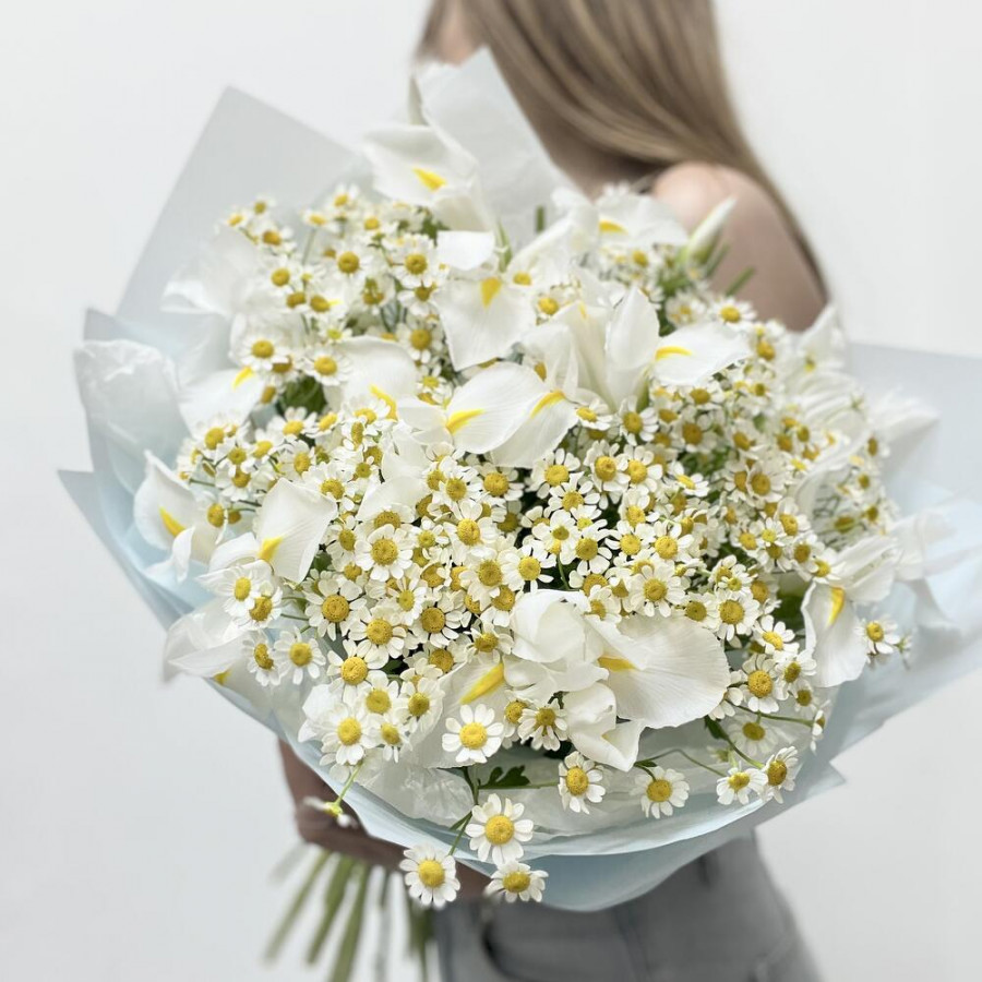 На фото букет из белых ирисов и ромашек. В составе: ирис 25 шт, танацетум 6 шт, дизайнерская упаковка 1 шт, атласная лента 1 шт, . Все цветы свежие и ароматные, букет красиво оформлен и отлично подходит для подарка. Доступна доставка цветов или самовывоз.