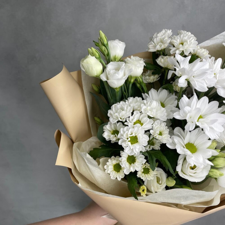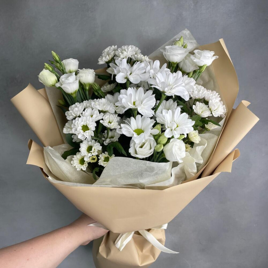 На фото букет из белых хризантем и эустом. В составе: альстромерия 3 шт, хризантема кустовая 4 шт, дизайнерская упаковка 1 шт, атласная лента 1 шт, . Все цветы свежие и ароматные, букет красиво оформлен и отлично подходит для подарка. Доступна доставка цветов или самовывоз.