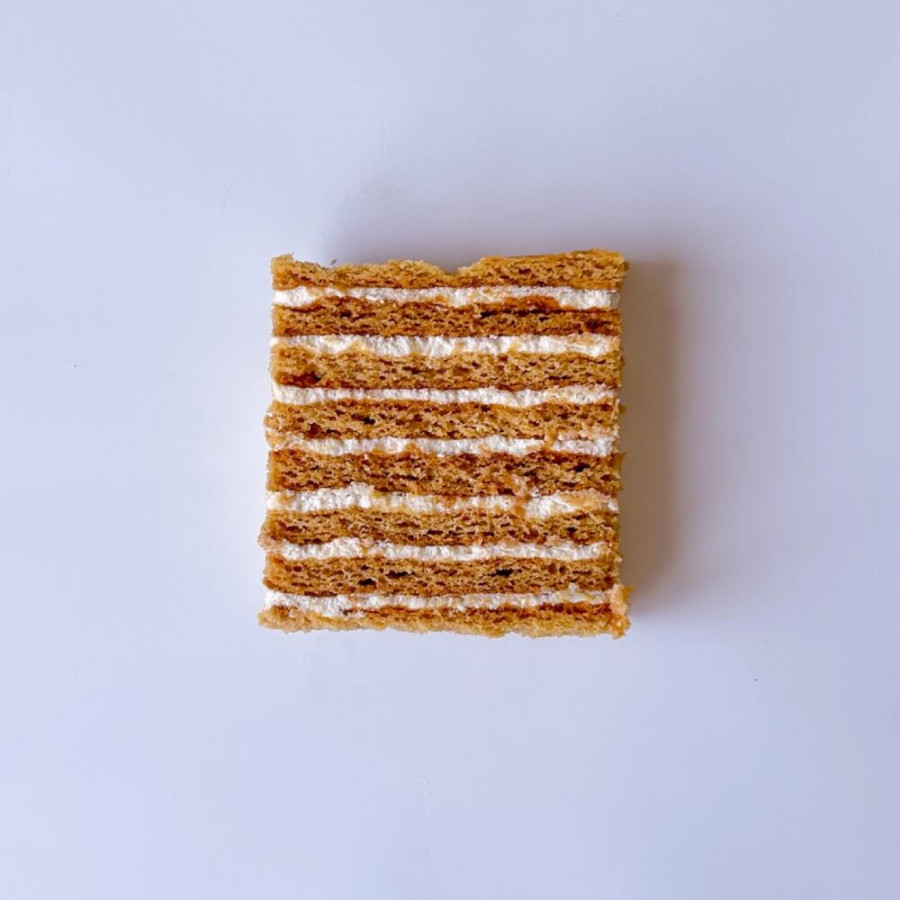 Медовик: гречишный мёд, сахар, яйца, мука, сливочное масло, сметана, сливки, творожный сыр, сахарная пудра, соль, пищевая сода Ванильный бисквит с клубникой: пшеничная мука, сахар, яйца, молоко, клубничное пюре, творожный сыр, сливки, сахарная пудра, ванильная паста, разрыхлитель, пектин, соль